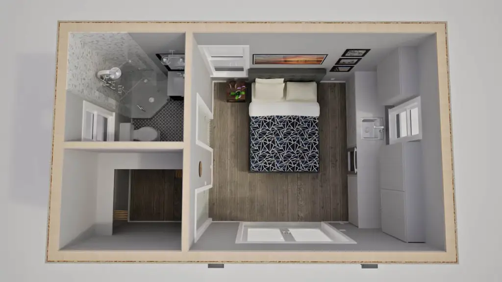 The bedroom area is integrated into the main living space, offering a comfortable and cozy sleeping area without sacrificing the open feel of the home. The design ensures you have the privacy you need while maintaining a sense of openness and flow throughout the space.